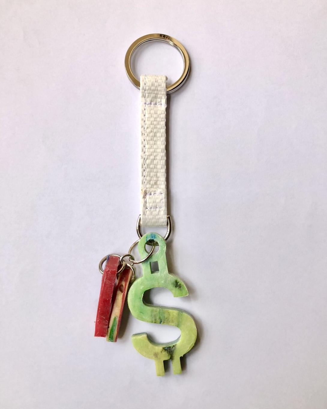 พวงกุญแจทำจากแผ่นพลาสติกรีไซเคิล สายใช้เศษผ้าใบเหลือจากการทำงาน