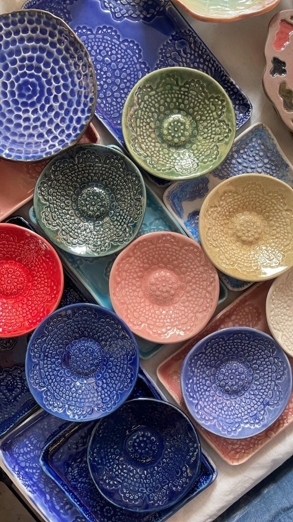 S: 8.5x8.5x7 cm. M: 9x9x9.5 cm. Plate: dia. 14 cm.