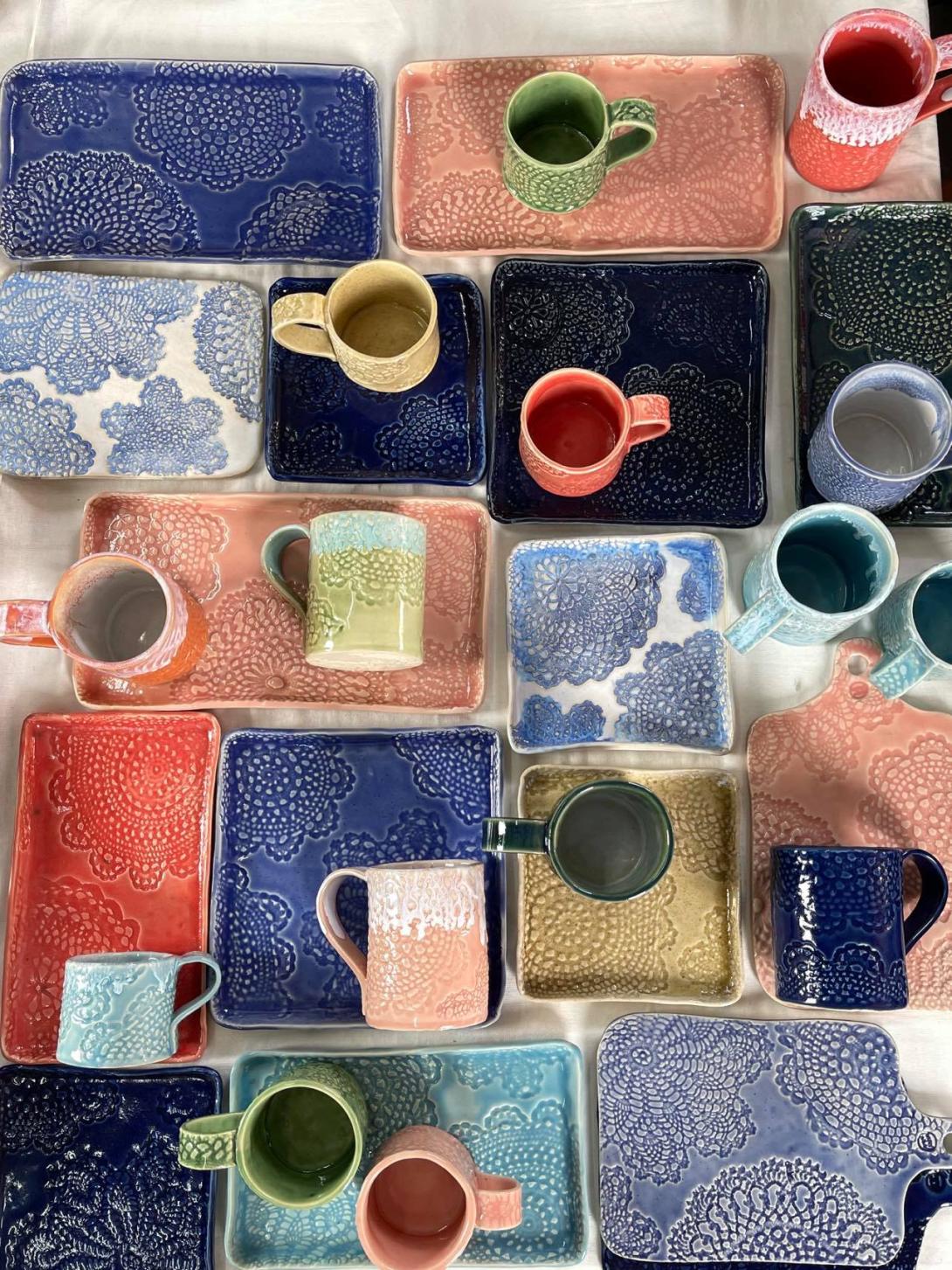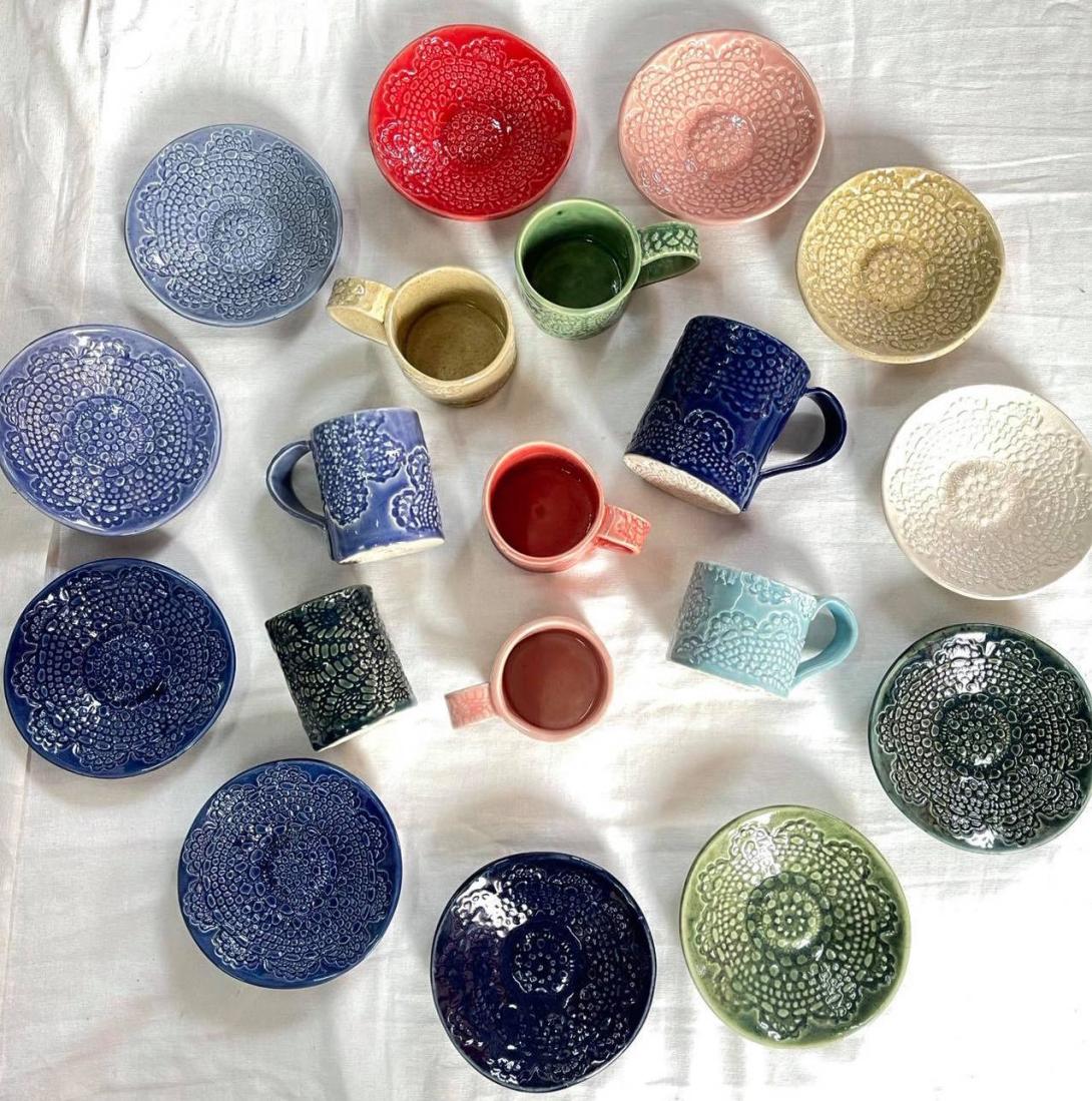 แก้วมัคลายลูกไม้และจานขนมลายลูกไม้