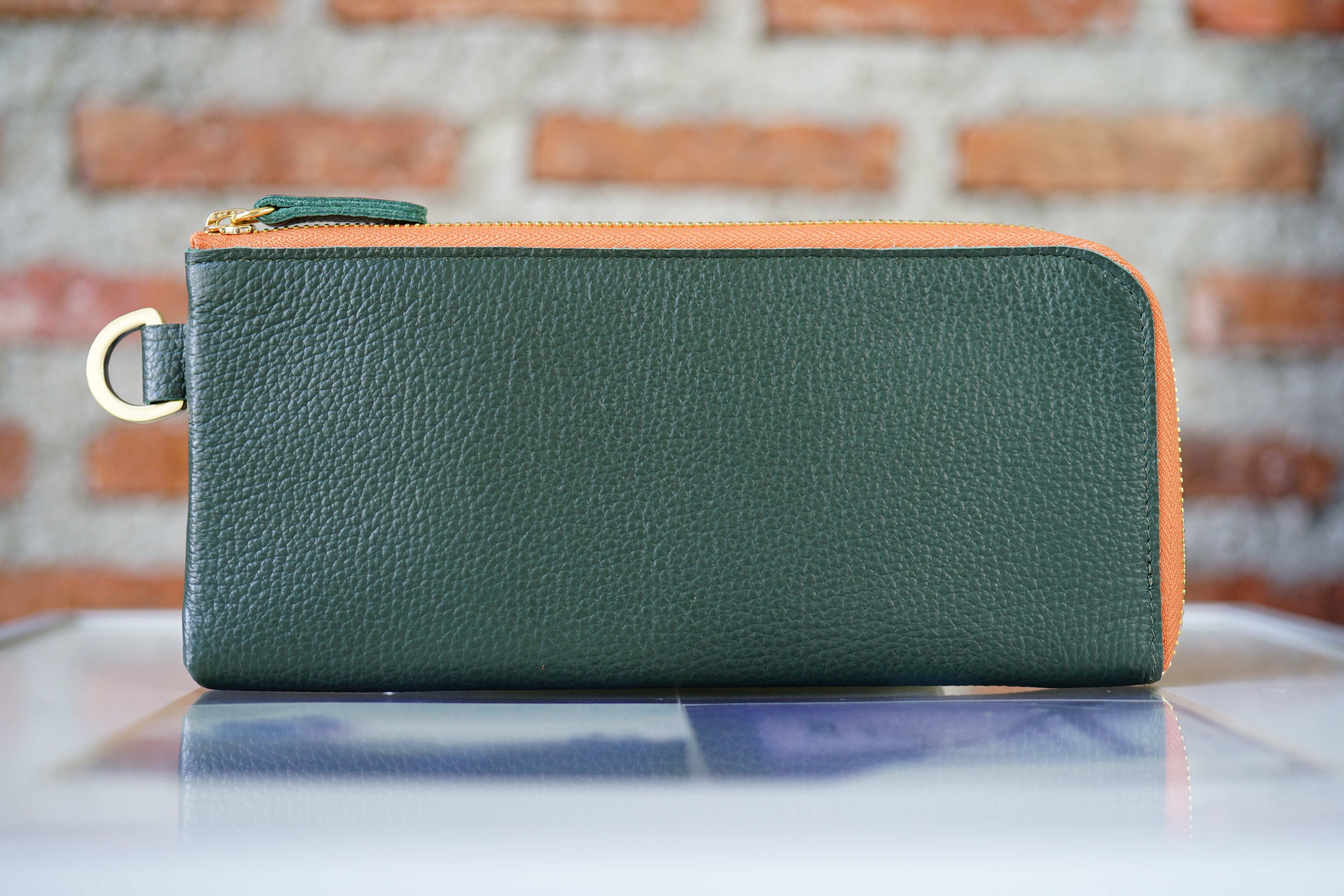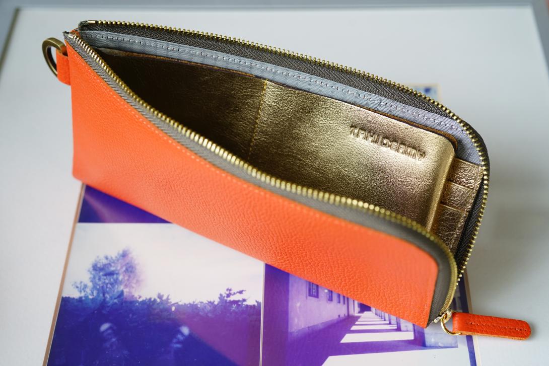 Leather lady’s Wallet, available in Green with orange, Orange with green, Pink with navy, Navy with pink, White pearl with olive green, and Gold with grey.